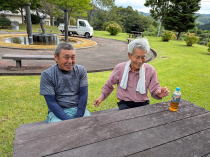 園内のベンチに坐っていると近くで草刈りをしていた男が手を止めて近寄ってきた。昼飯時なので男も小型クーラーを手にして一緒に食べたい風である。並び坐っていろいろ話しているうちに互いにすっかり打ち解けて、そのうち男がクーラーの中から残りのおにぎりと冷えた麦茶のペットボトルを出して俺にくれた。握り飯は自分の田圃で作った「ささにしき」だという。押し頂いて有り難く頬ばる。美味かった!