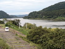 朝の北上川 泥んこの廃林道を4WD車で 立ち塞がる倒巨木を越えて 大津波が襲った雄勝湾