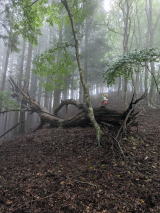 ブナ林の中の巨大な伐り株 谷川の中をポイントに向かう 白木野人形送り