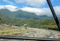 広い河川敷の富士川 雨の見延町を行く |