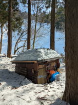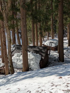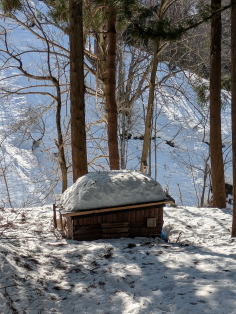 積雪は1.5メートル程か。「おやじ小屋」も「風の小屋」も深い雪に埋もれたまま、無事だった。テラスの回りをベニヤ板で打ち付けた雪囲いを跨いで「風の小屋」に入る。留守の間の埃とヒメネズミが騒いで散らかしたゴミの掃除を済ませて、ようやく「鍋焼きうどん」の昼飯にありついた。午後1時半だった。