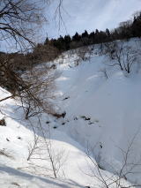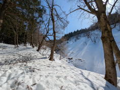 小屋に戻り、部屋の中を片付ける。一通り帰りの準備が出来て、外に出てスノーシューを履く。そして最後の山回りである。東側の斜面からカタクリ広場に出て若杉の森の中を歩き、地蔵広場から広葉樹の森、そしておやじ小屋から黄土沢に下りて谷戸の小川に沿って一回りした。