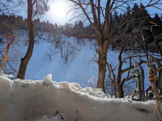 その後は、風の小屋のドアーに通じる雪囲いのベニヤ板を外し、テラス前の雪壁に階段を付けてから、健介さんの下山を見送った。