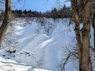 その後は折りたたみ椅子をテラスの前の日だまりに備えて、それに座ってコーヒーを飲みながら日向ぼっこをした。朝は日が陰って白くくすんでいた山菜山の斜面が、日が高く昇るにつれて銀色に輝き出し、緩やかに起伏する尾根と谷の湾曲が艶めかしいほどの雪肌となる。そのなめらかな雪肌に小さな雪崩跡のかき傷があり、獣の足跡が微笑ましく続いて、まるで大キャンバスに描かれた墨絵を観ているようである。