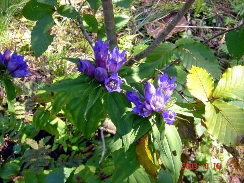 おやじ山の入口から少し入った開けた草地や尾根道にポツポツと生えている。秋の花数の少ない時 期にこのリンドウの紫色の花が心を和ませてくれる。殆どがまわりの草に寄りかかって斜めに生えて いるので間違って刈ったり一輪車で轢いてしまったりする。 背丈がせいぜい30pほどなので、秋の弱い光の中で精一杯太陽の光を求めているように思える。 日射しが充分でないと蕾んだままで、なかなか花を開いてくれない。
