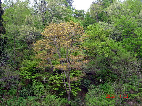 春の新緑の山肌の中にあって、紅色の新芽や葉が一際目立って遠くからでもアカイタヤだと分かる。 新葉が赤く展開する前に、先ず黄色い小さな花が、新しい枝の先に数個固まって咲く。 北海道や日本海側の山地に生えて大木となるカエデである。おやじ山の奥には両手を広げるほどの直 径の巨木があり、「関のアカイタヤ」と勝手に名付けている。