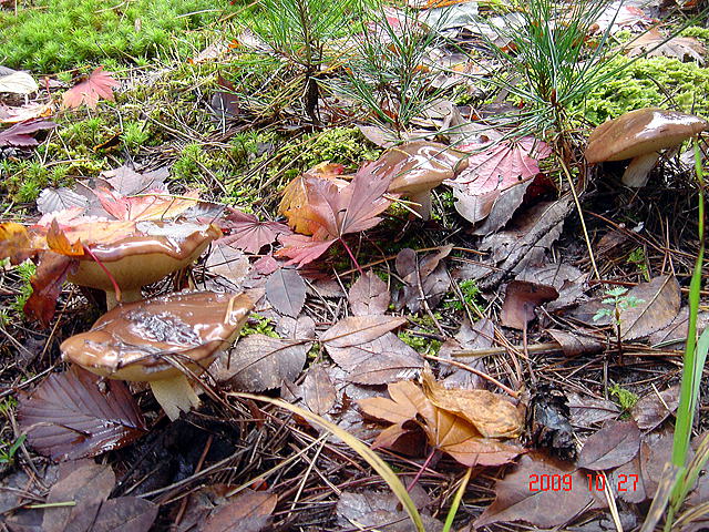 2009年の秋は不思議な年で、写真のジカボウ(ヌメリイグチの越後の方言)がシーズン遅くまで発生した。通常は10月初めのいわばシーズン初期のキノコである。まとまった雨が降って2日、3日もすると松林のあちこちからニョキニョキと出て籠一杯になるのである。そして雨の後ではキノコの傘がテカテカと光って実に見つけやすい。