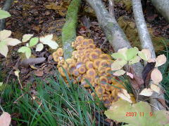 最近の研究ではナラタケの種類はDNA鑑定で38種に分類されるのだという。 コナラなどの広葉樹の倒木や切り株などに群がって発生するが、2010年秋にはそれこそおやじ山の至る所に大発生した。 |