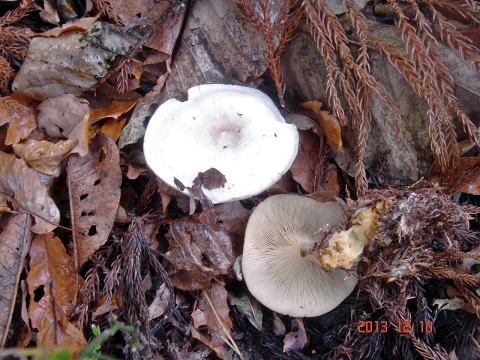 | 傘は10〜15cmほどで、おやじ山の裏斜面のスギ林に生えていた。傘はまんじゅう形から浅いじょうご形になり、時には傘の径は25cm以上にもなる。この年の発生は通年より大分遅く、周りの同種は既に崩れていた。一応「オオイチョウタケ」と同定したが・・・? |