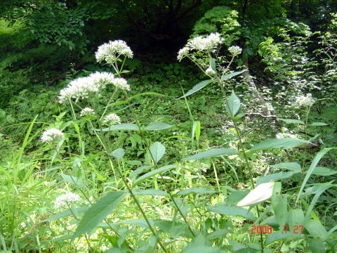 おやじ山へ行く途中に長岡の街が一望できる「見晴らし広場」があり、そこからのハイキングコー スをしばらく行くと今度は森立峠などの東山の連山が見える開けた山道に出る。 この斜面のワラビ畑の中にヒヨドリバナやヤマユリが咲き誇り、真夏の清涼剤となって足を止めさ せるのである。