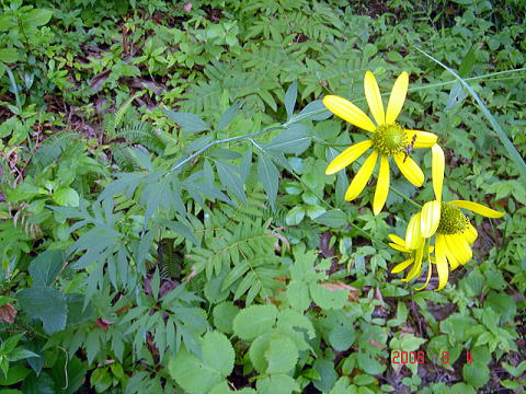 「瞑想の池」に行く途中に生えていた。北米原産の帰化植物で、明治の中ごろ園芸植物として持ち込 まれたものが野生化したものである。葉の形などはハンゴウソウに似ているが花びら(舌状花)が大 きいので区別できる。