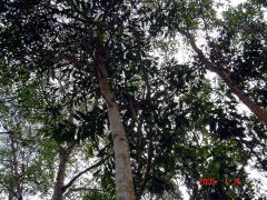 高木層の優先種はアカシアマンギョウム(マメ科)である。過去に裸地化した森にこの木を植えたのだから当然である。植えて何年くらい経つのだろう? 幹の胸高直径はせいぜい20cm位で、まだ若い感じである。樹高は10〜15m程でひょろ長く枝を伸ばしている。アカシアといっても日本でみられるニセアカシアのように複葉ではなく単葉、幹の色は灰褐色である。ガイドのタデウスさんの話では、この木は30〜40mまで成長しパルプ用材や家具作りに利用するのだそうだ。