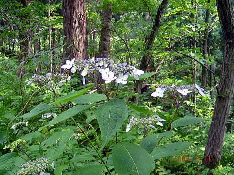 おやじ山が梅雨を迎える頃になると、淡いブルーの大きな花がシックな装いで森陰を飾る。おやじ山 には多い木で大好きな花ゆえ下刈りでは刈らずに残しておく。飾り花(ガク片)は初めは白っぽいが 次第に濃い青紫色に変化し、最後には色あせてまた白っぽくなる。